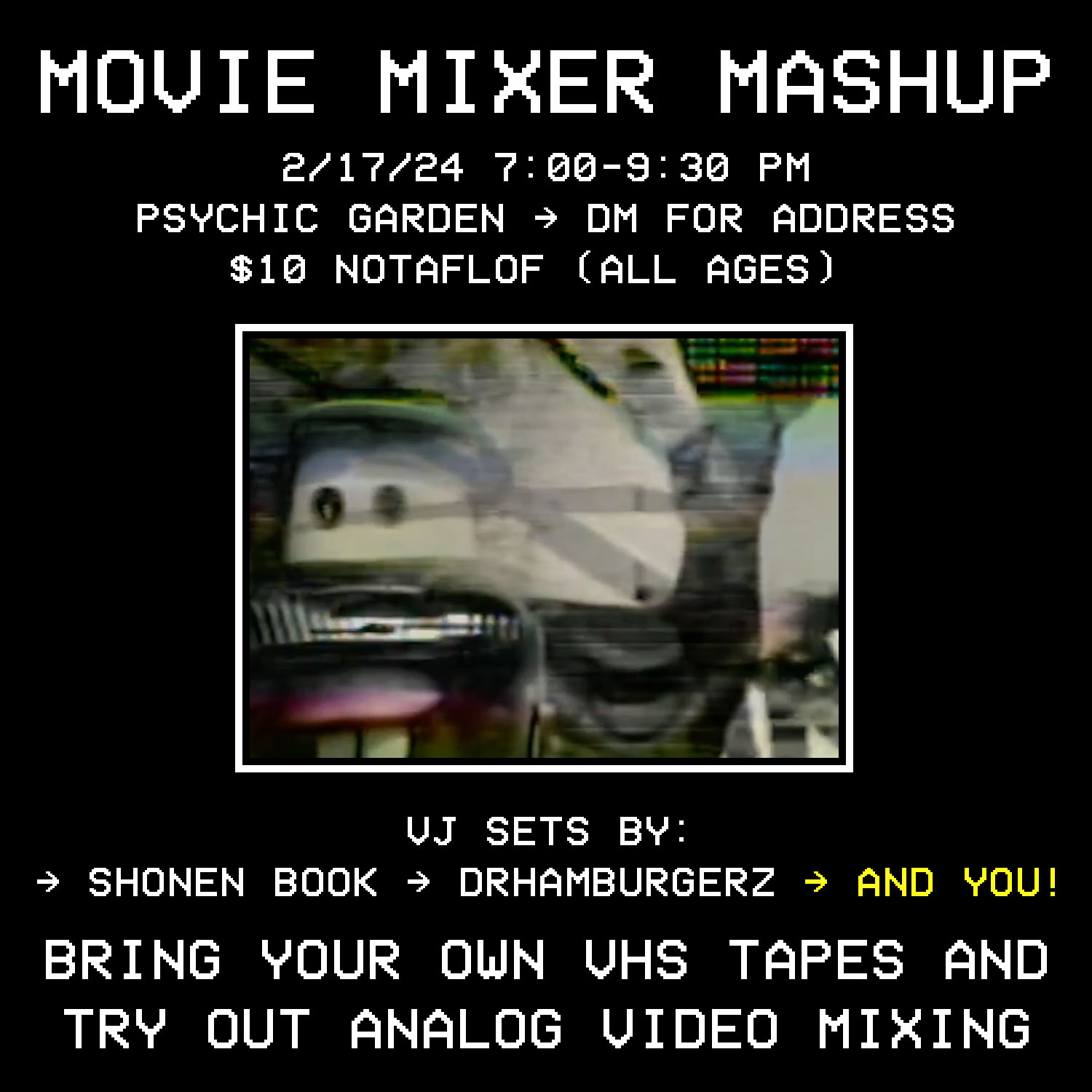 Sets by drhamburgerz and shonen book, then an open jam where you can try out analog mixing. Bring your own movies on VHS or pick some of ours, it’s aContinue readingMovie Mixer Mashup